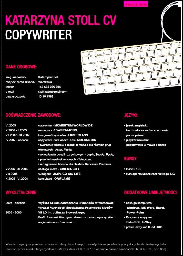 Katarzyna Stoll- Copywriter CV was posted in August 10, 2017 at 9:22 am. If you wanna have it as yours, please click the Pictures and you will go to click right mouse then Save Image As and Click Save and download the Katarzyna Stoll- Copywriter CV Picture.. Don’t forget to share this picture with others via Facebook, Twitter, Pinterest or other social medias! we do hope you'll get inspired by SampleTemplates123... Thanks again! If you have any DMCA issues on this post, please contact us!