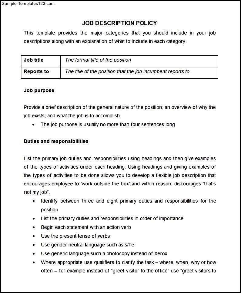 Job Description Policy Template was posted in May 31, 2017 at 3:30 pm. If you wanna have it as yours, please click the Pictures and you will go to click right mouse then Save Image As and Click Save and download the Job Description Policy Template Picture.. Don’t forget to share this picture with others via Facebook, Twitter, Pinterest or other social medias! we do hope you'll get inspired by SampleTemplates123... Thanks again! If you have any DMCA issues on this post, please contact us!