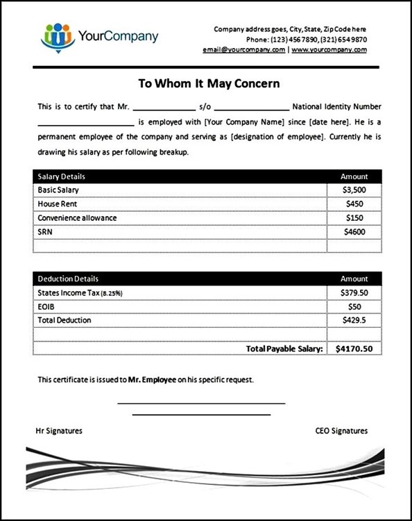 Employee Salary Certificate Template MS Word
