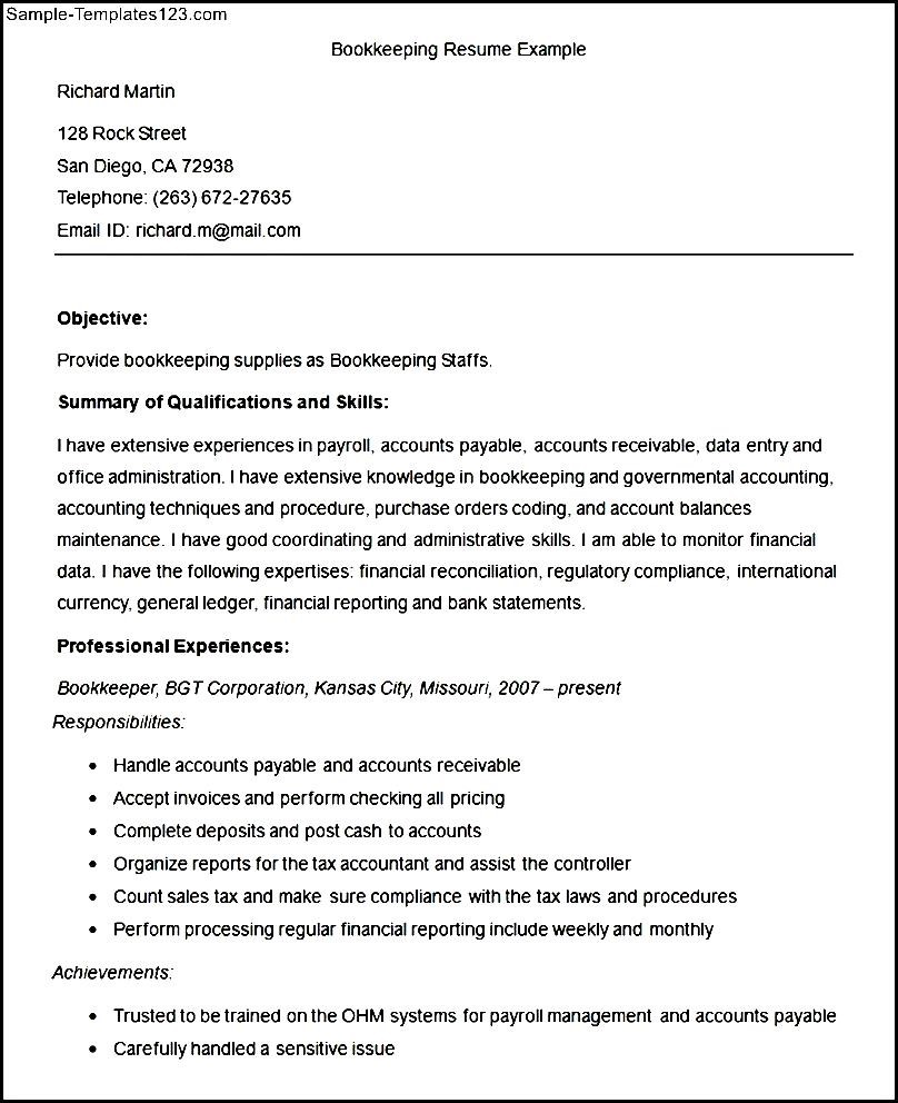Sample Bookkeeping Resume Template was posted in August 14, 2017 at 12:27 pm. If you wanna have it as yours, please click the Pictures and you will go to click right mouse then Save Image As and Click Save and download the Sample Bookkeeping Resume Template Picture.. Don’t forget to share this picture with others via Facebook, Twitter, Pinterest or other social medias! we do hope you'll get inspired by SampleTemplates123... Thanks again! If you have any DMCA issues on this post, please contact us!