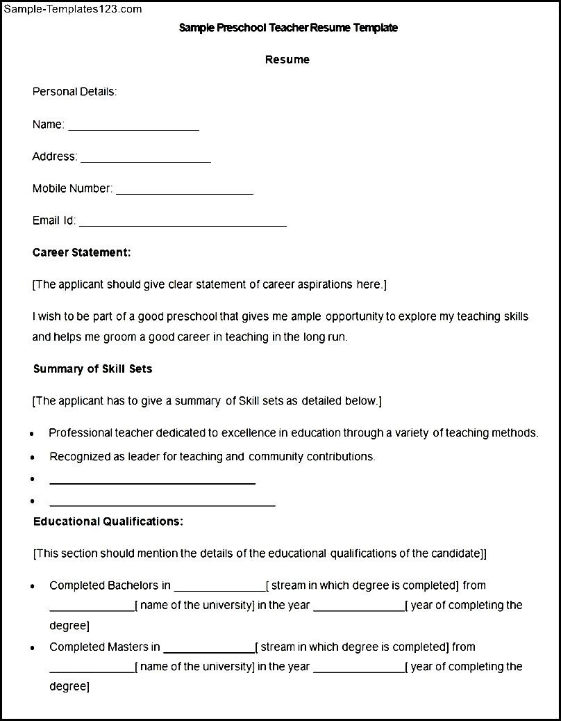 Sample Preschool Teacher Resume Template