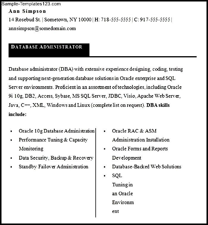 Sample Resume Database Administrator was posted in August 18, 2017 at 6:42 pm. If you wanna have it as yours, please click the Pictures and you will go to click right mouse then Save Image As and Click Save and download the Sample Resume Database Administrator Picture.. Don’t forget to share this picture with others via Facebook, Twitter, Pinterest or other social medias! we do hope you'll get inspired by SampleTemplates123... Thanks again! If you have any DMCA issues on this post, please contact us!
