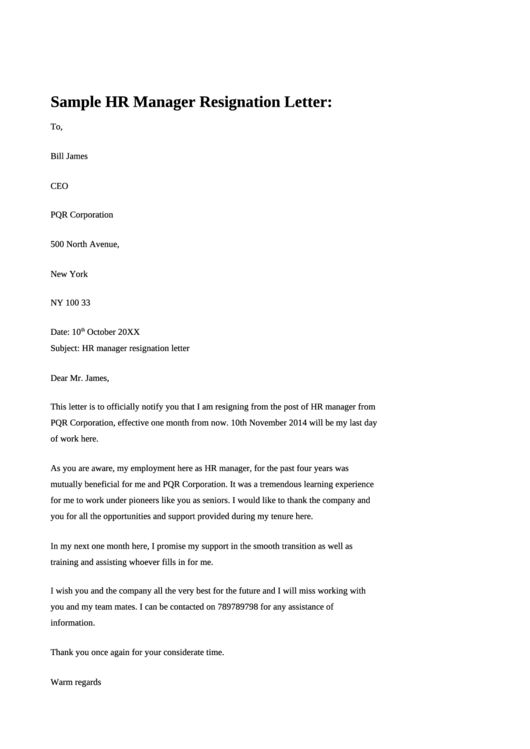 Sample Letter Of Resignation To HR