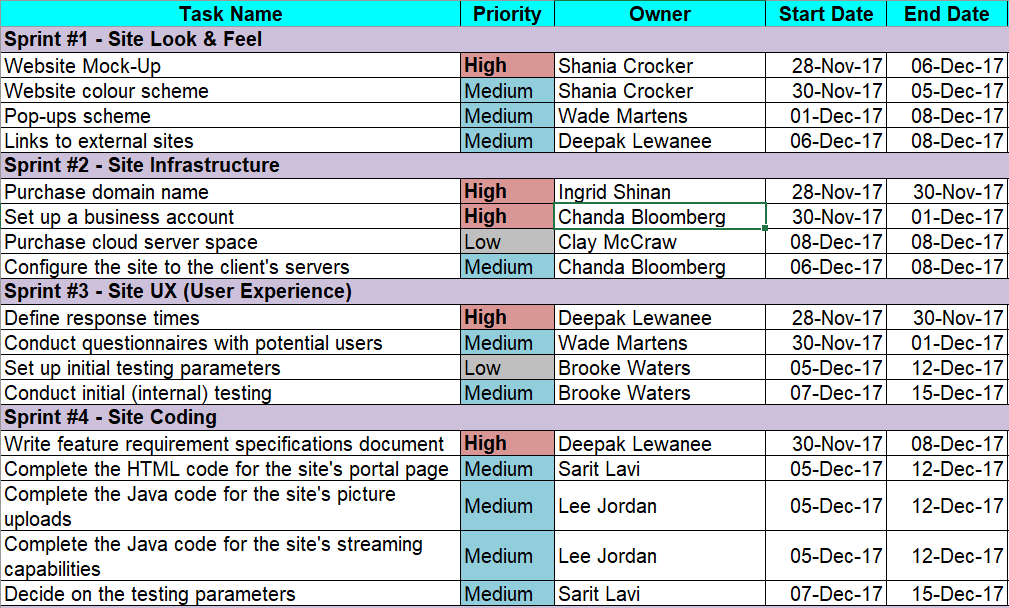 - Communication Channels: Email, meetings, project website, status reports.