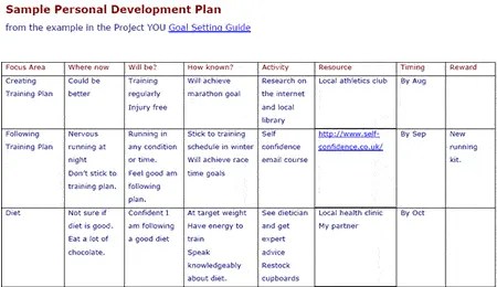 | Improve public speaking skills | Join Toastmasters. | Within 2 weeks | Toastmasters membership fee. | Joined. | Attend meetings regularly. |